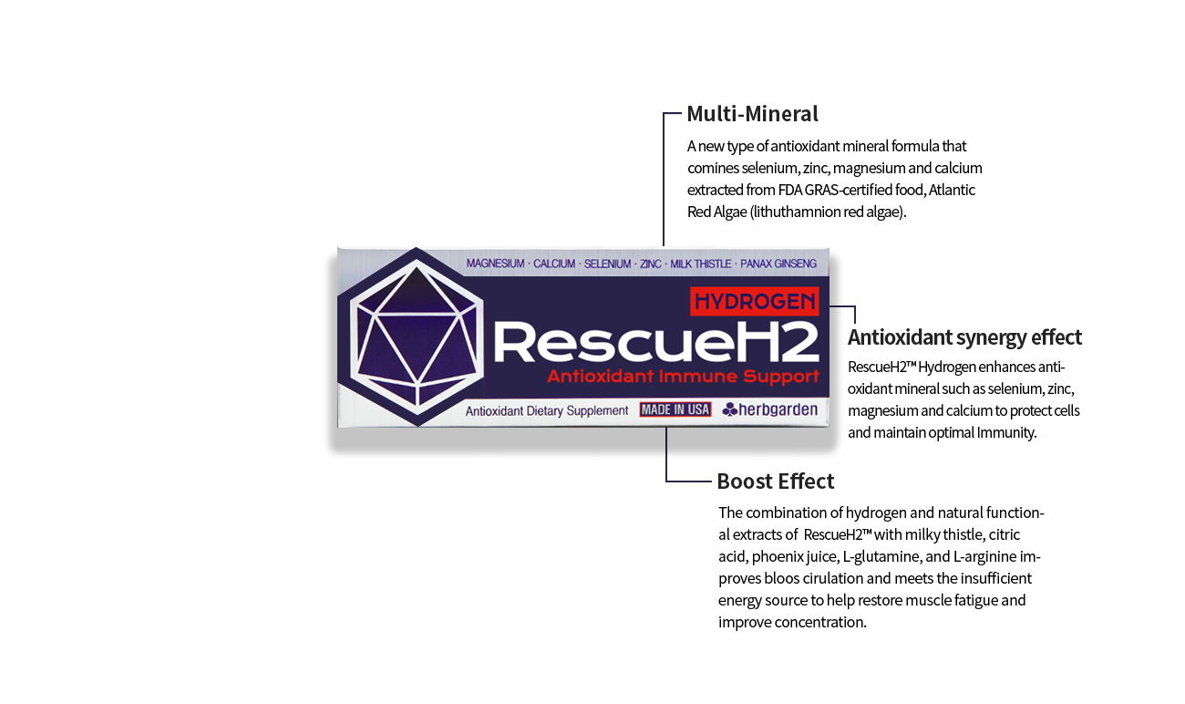 RescueH2™ Hydrogen enhances anti- oxidant mineral such as selenium, zinc, magnesium and calcium to protect cells and maintain optimal Immunity.